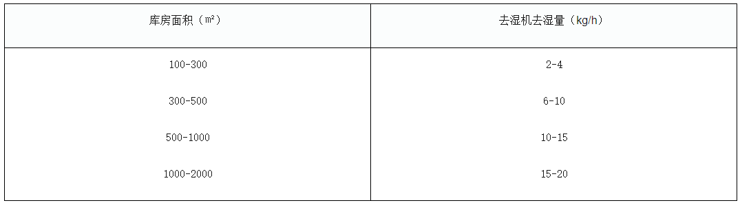 濕度調(diào)節(jié):我們?cè)谶x購(gòu)去濕機(jī)時(shí),要根據(jù)室外空氣濕度、庫(kù)內(nèi)要求達(dá)到的標(biāo)準(zhǔn)濕度、庫(kù)房建筑結(jié)構(gòu)、門窗大小及工作人員情況等因素綜合考慮。去濕機(jī)容量的選擇可以參考下表: